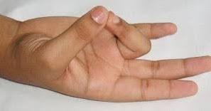 मध्यमा उंगुली को मोडकर अंगूठे के मूल में लगाकर अंगूठे से दबाएं। शेष तीनों अंगुलियां सीधी रखें।